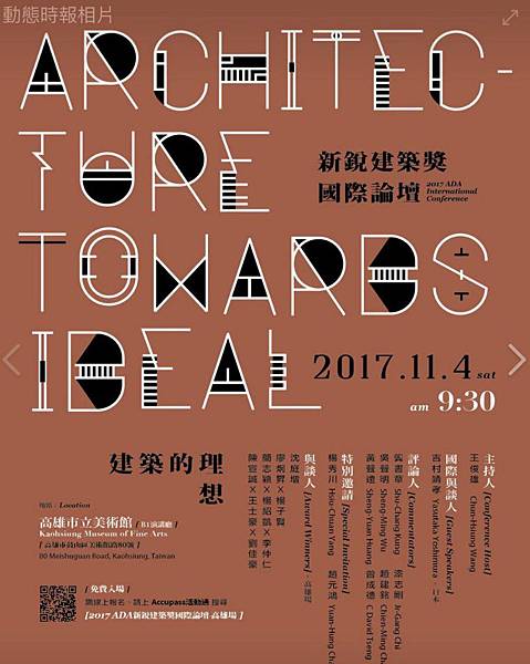 新銳建築獎國際論壇,將於2017.11.4星期六早上九點半開始一整天,在高雄市立美術館舉辦建築國際論壇活動。主持人王俊雄老師邀請了國際與談人:吉村靖孝。評論人:黃聲遠、龔書章、曾成德、趙建銘、漆志剛、吳聲明。邀請講座:楊秀川、趙元鴻。與談人:沈庭增、廖炯昇、楊子賢、簡志穎、楊紹凱、李仲仁、陳宣誠、王士豪、劉佳豪。